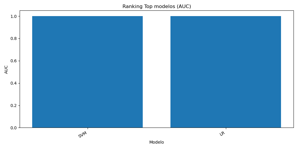 Ver memoriaComparativa entre SVM, regresión logística y Random Forest mediante recall, precision, F1, AUC y balanced accuracy.